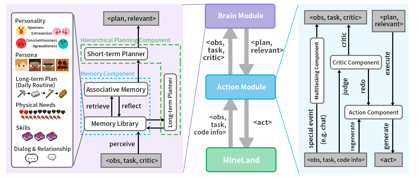 我们搭建了一个Simulator作为Agent与Minecraft游戏之间的桥梁,支持128+个Agent加入,引入了多模态的数据,包括视觉、听觉、触觉等。以Code为Action Space,提供Low-level和High-level两套Action。