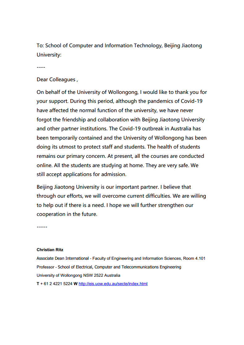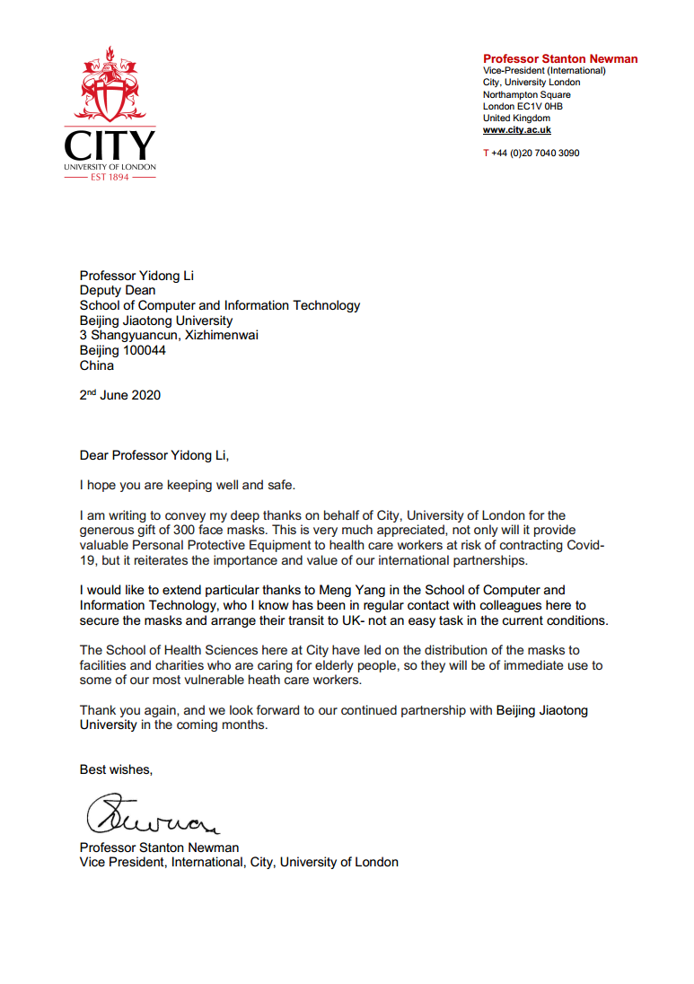 伍伦贡大学电子,计算机与电信工程学院副院长Christian Ritz教授在信中写到,“我代表伍伦贡大学,感谢您的支持。这段时间,尽管新冠肺炎已经影响了我校的基本运转功能,但我们从未忘记和北京交通大学的友谊和合作”,“北京交通大学是我们的重要合作伙伴。我相信我们可以共渡难关,如果贵校需要任何帮助,我们一定伸出援手。我希望在未来进一步加强双方合作”。伦敦城市大学副校长Stanton Newman教授在信中写到,“我代表伦敦城市大学向您表示深深的感谢,您慷慨捐赠的口罩不仅向奋战在抗击新冠肺炎一线的工作人员提供了宝贵的个人防护物资,更是重申了我们国际合作关系的重要性和价值”,“我想特别感谢p站的杨萌女士,她和我的同事们多次沟通,最终将口罩顺利寄到了英国,在目前的情况下这不是一件容易的事”。