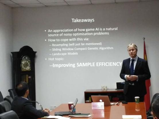 随后,Simon Lucas教授为p站 师生做题目为“Game AI, Game Design and Noisy Optimisation”的讲座,并与师生热烈讨论。