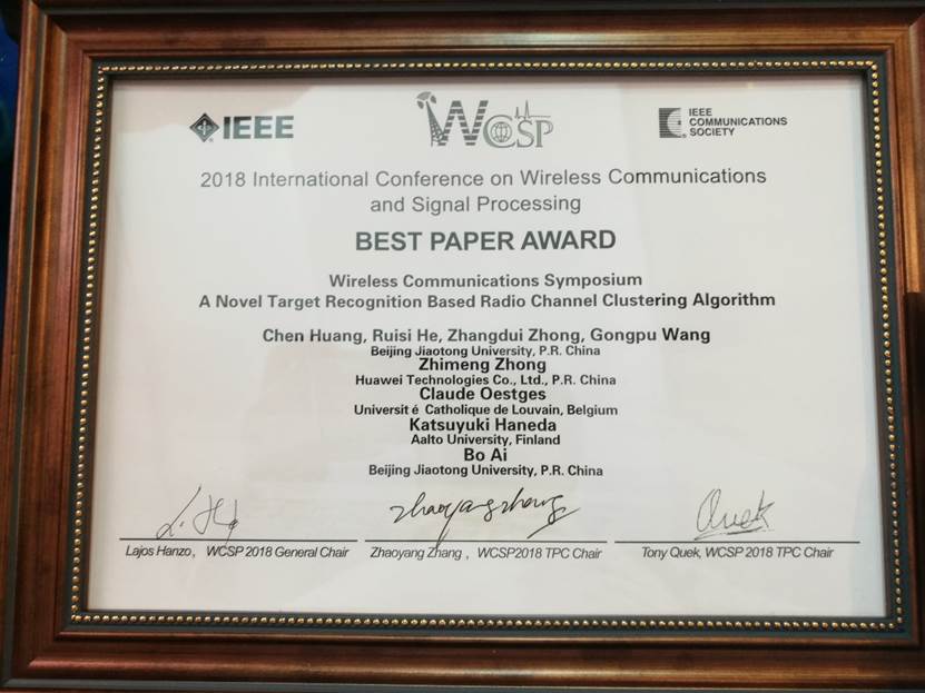 2018年10月17至19日,第十届无线通信与信号处理国际学术会议在杭州召开,p站 2016级博士生生黄晨在何睿斯副教授和钟章队教授指导下撰写并发表的论文“A Novel Target Recognition Based Radio Channel Clustering Algorithm”获这次会议最佳论文奖。本次会议共收到700余篇投稿,最后共录用287篇文章。