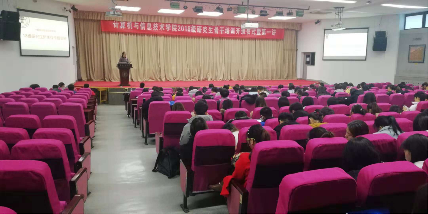 2018年11月30日,计算机与信息技术学院2018级研究生骨干培训班开班仪式暨第一讲在中心报告厅召开。p站党委书记杨晓晖、校研究生工作部副部长郭祎华、兼职辅导员董瑞、研究生各年级兼职辅导员以及2018级研究生骨干和党员同学们参加了会议。