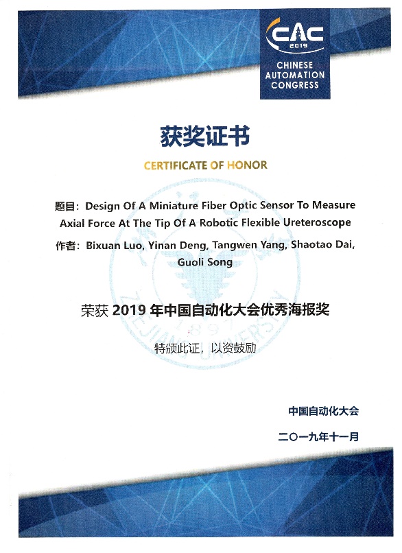 中国自动化大会是由中国自动化学会主办的国内最高层次的大型综合性学术会议。今年大会共录用了1200余篇学术论文,并进行了海报展示。经过专家的严格评审,选出本届大会的“优秀海报”总共34篇(//www.cac2019.org/show.php?id=102)。其中,p站 研究生罗碧璇同学的论文“Design of a Miniature Fiber Optic Sensor to Measure Axial Force at the Tip of a Robotic Flexible Ureteroscope”获奖。