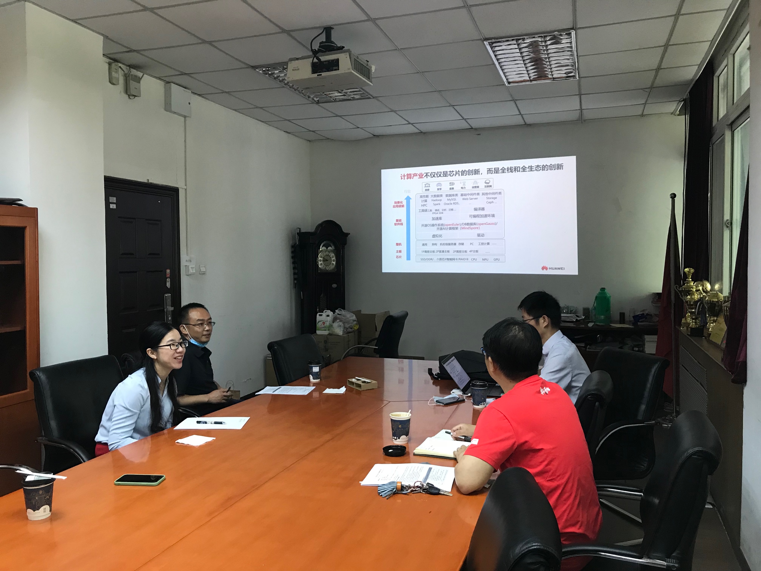 5月21日上午在p站会议室,p站与华为公司举行“智能基座”产教融合项目落地研讨会。参加会议的有p站教学副院长熊轲、“专业实习与实训”课程负责人安高云,华为计算产品线资深人力资源经理李春梅、华为鲲鹏总工李国军。