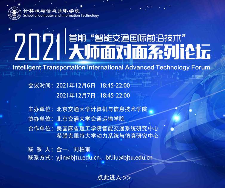 p站» p站动态 » 预告:p站首期“智能交通国际前沿技术”大师面对面系列论坛将于2021年12月6日-12月7日举办 预告:p站首期“智能交通国际前沿技术”大师面对面系列论坛将于2021年12月6日-12月7日举办 发布时间:2021-11-29 阅读次数: 由北京交通大学、美国麻省理工学院以及希腊克里特大学联合举办的首期“智能交通国际前沿技术”大师面对面系列论坛将于2021年12月6日-12月7日在线上举行。届时,论坛将邀请来自欧洲和美国的三位著名学者,就城市智能交通、网联智能化无人车、交通控制理论与方法、车路协同与自动驾驶等研究领域进行深入探讨。论坛旨在交流智能交通系统等国际前沿技术,诚邀对未来智能交通领域研究感兴趣的老师同学参加本次论坛!