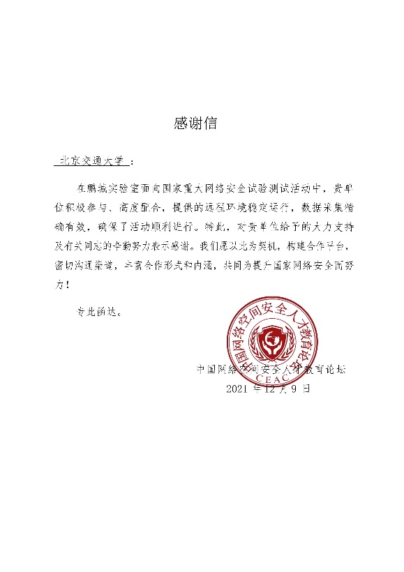 p站» p站动态 » p站信安团队参与国家重大网络安全试验测试活动获感谢信 p站信安团队参与国家重大网络安全试验测试活动获感谢信 发布时间:2022-02-18 阅读次数: p站信安团队参与国家重大网络安全试验测试活动获感谢信 在近期鹏城实验室面向国家重大网络安全试验测试活动中,北京交通大学网络空间安全学科责任教授刘吉强老师领队、童恩栋和牛温佳老师指导的研究生团队(吴亚伦、武兴宇、田蕴哲、相迎宵、孙瑞等)积极配合,保障了北京交通大学靶场节点的远程环境稳定运行、数据采集精确有效,获鹏城实验室、中国网络空间安全人才教育论坛(“网教盟”)、中国网络空间新兴技术安全创新论坛(“新安盟”)感谢信。