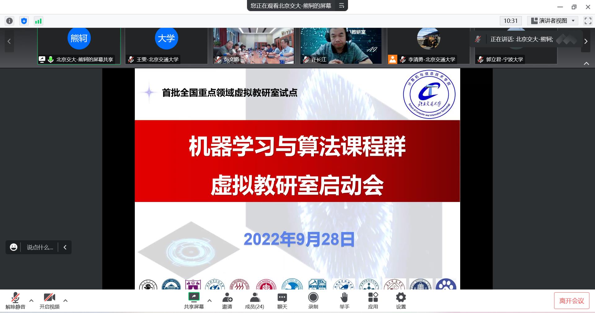 机器学习与算法课程群虚拟教研室于2022年9月28日下午通过线上线下结合的方式召开建设启动会。会议由北京交通大学计算机与信息技术学院副院长熊轲教授主持,重点领域教学资源建设项目管理办公室副主任许长江、北京交通大学本科生院副院长宋瑞、北京交通大学计算机与信息技术学院院长蔡伯根参加会议并致辞,北京交通大学、武汉大学、南京大学、北京航空航天大学、北京邮电大学、西南交通大学、中国矿业大学、华中师范大学、桂林电子科技大学、宁波大学、西北师范大学和武夷学院等虚拟教研室成员单位的专家和教师代表出席了会议。