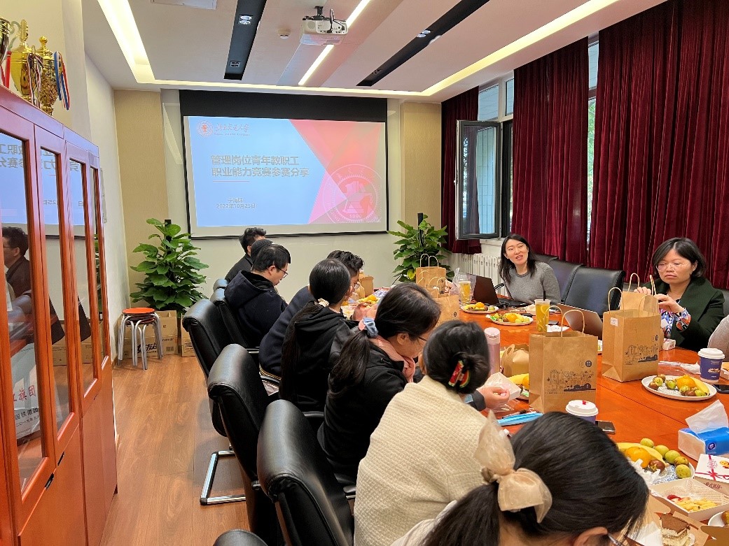 随后,于海妹老师结合参加北京交通大学第一届管理岗位青年教职工职业能力竞赛的心得做了题为《管理岗位青年教职工职业能力竞赛经验分享》的报告,对赛程的要求,自己的准备工作做了详细的介绍,强调了专业知识、公文写作、语言表达等能力对管理岗人员的重要性。她总结,充分的准备、日常的积累、平稳的心态是赢得此次比赛的关键。在座的老师深受启发,纷纷表示此次分享活动受益匪浅,并结合自己岗位工作实际,做了经验分享和问题分析,大家积极讨论,气氛融洽热烈。