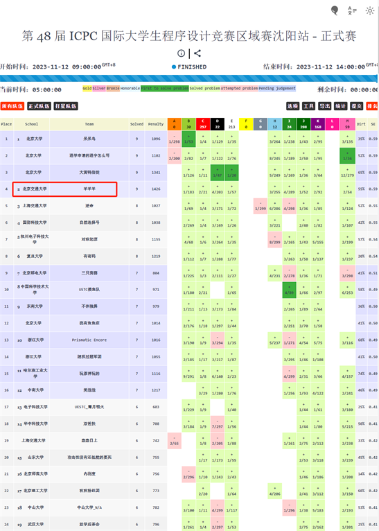 第48届ICPC国际大学生程序设计竞赛区域赛沈阳站榜单