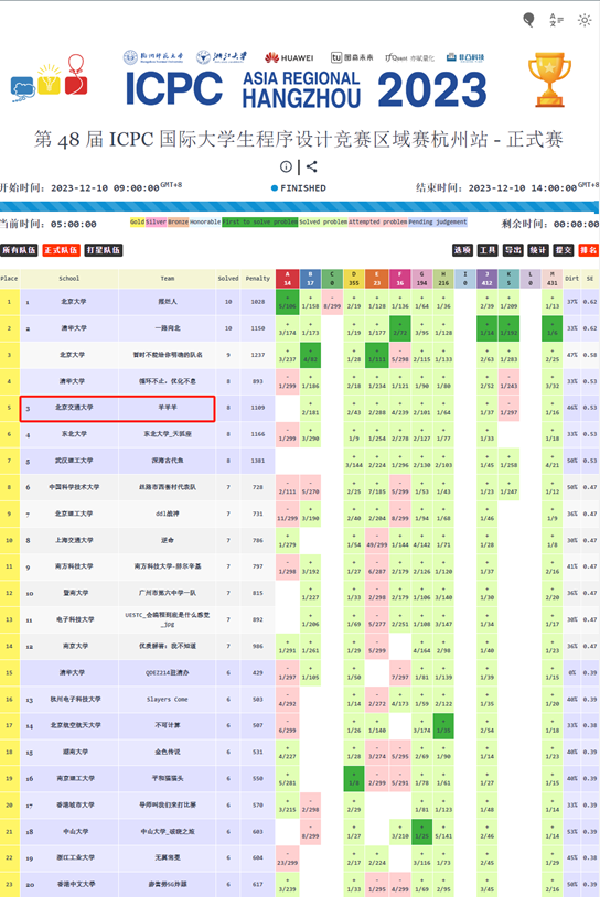第48届ICPC国际大学生程序设计竞赛区域赛杭州站榜单