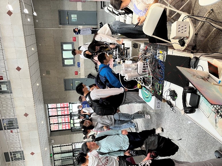 27日早,“英才计划”中学生首先来到了思源楼大厅及楼前广场,认真观摩了大学生创新创业项目的实物类作品展。同学们在一个个各具特色的科技作品之前驻足研究,不断与研发作品的团队成员交流讨论,了解科技作品的应用场景和技术特点,对科技作品研发的思路和流程有了直观的理解。通过对于创新作品的参观,不仅使“英才计划”中学生受到了创新精神的熏陶,同时也增进了同学们对我校不同学科特色的了解。