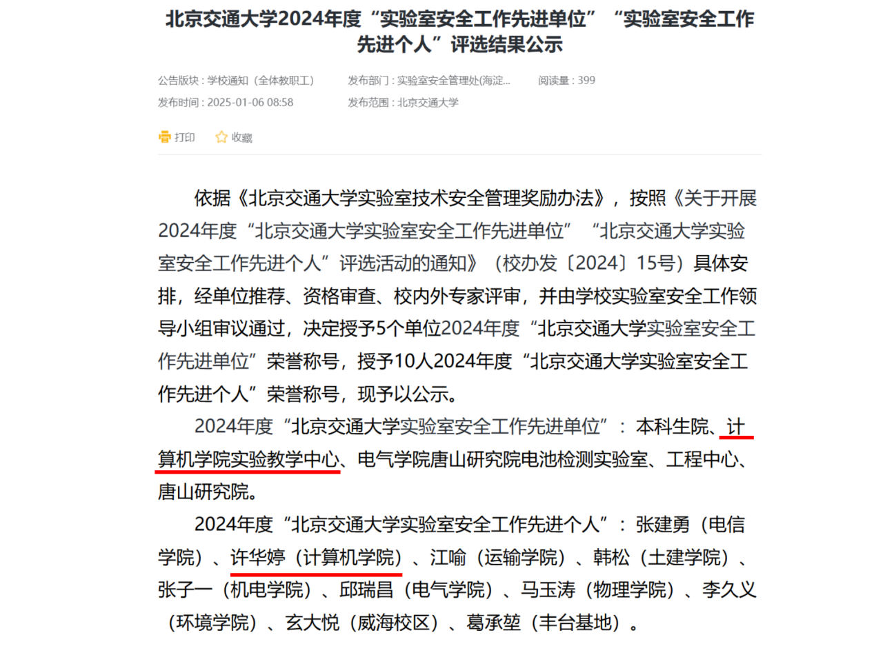 近日,北京交通大学2024年度“实验室安全工作先进单位”“实验室安全工作先进个人”评选公示,计算机实验教学中心(下称“中心”)凭借出色的安全管理工作获评2024年度“北京交通大学实验室安全工作先进单位”,中心许华婷老师也因在实验室安全保障方面的突出贡献,荣获2024年度“北京交通大学实验室安全工作先进个人”称号,这一喜人的成果彰显了学校对于实验室安全工作的高度重视以及计算机实验教学中心在安全管理上的卓越成效。
