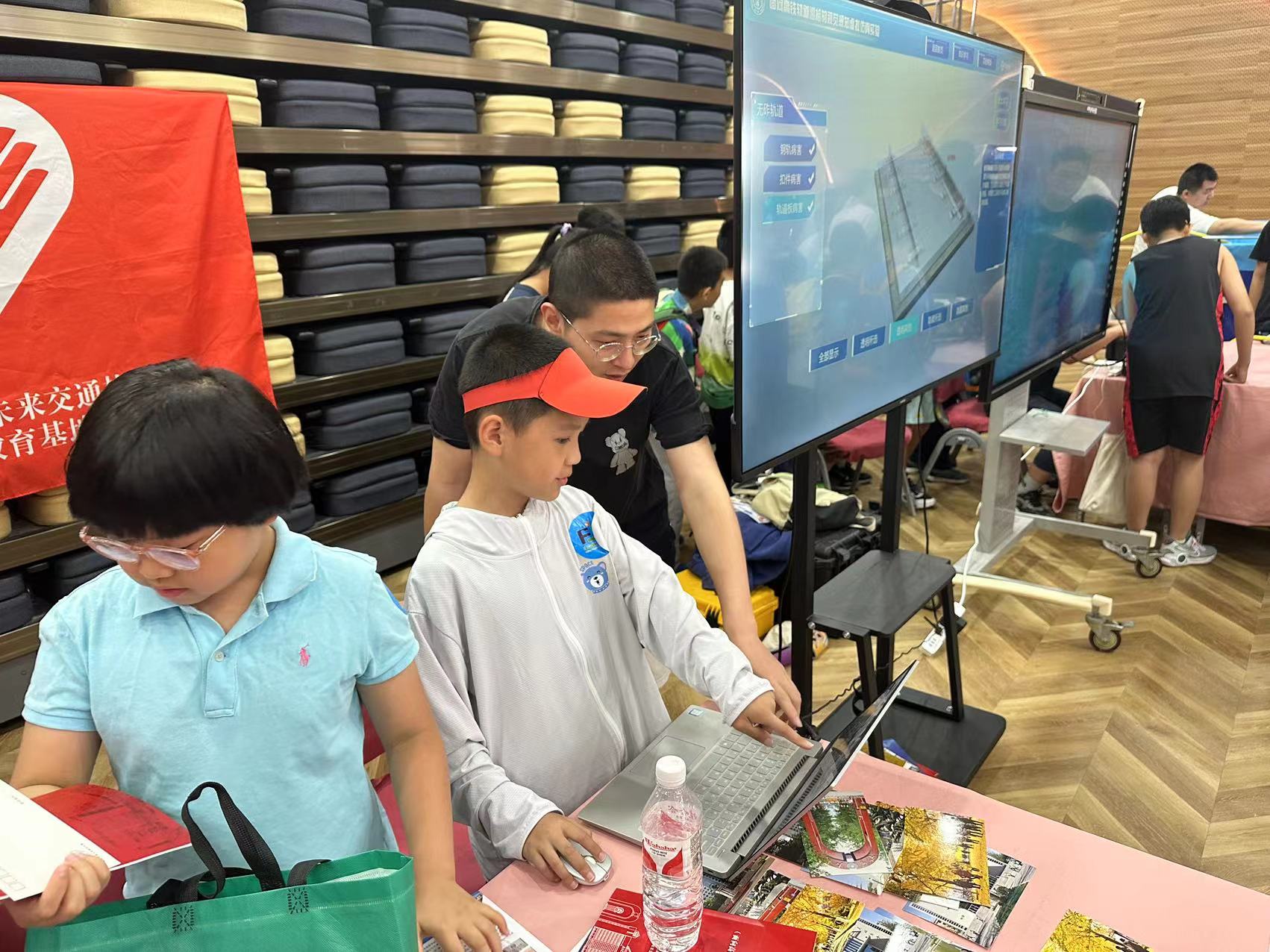 在主校区逸夫101科普基地实验室举办的科普展览每天开放,让来访者们沉浸在科学的世界中。在科普基地中展示的平行驾驶平台,小朋友们踊跃参与试驾体验,都成为小小“AI驾驶员”。通过对铁路轨道和智能巡检车的观察和操作,小朋友们对人工智能技术和应用有了更直接的感悟。