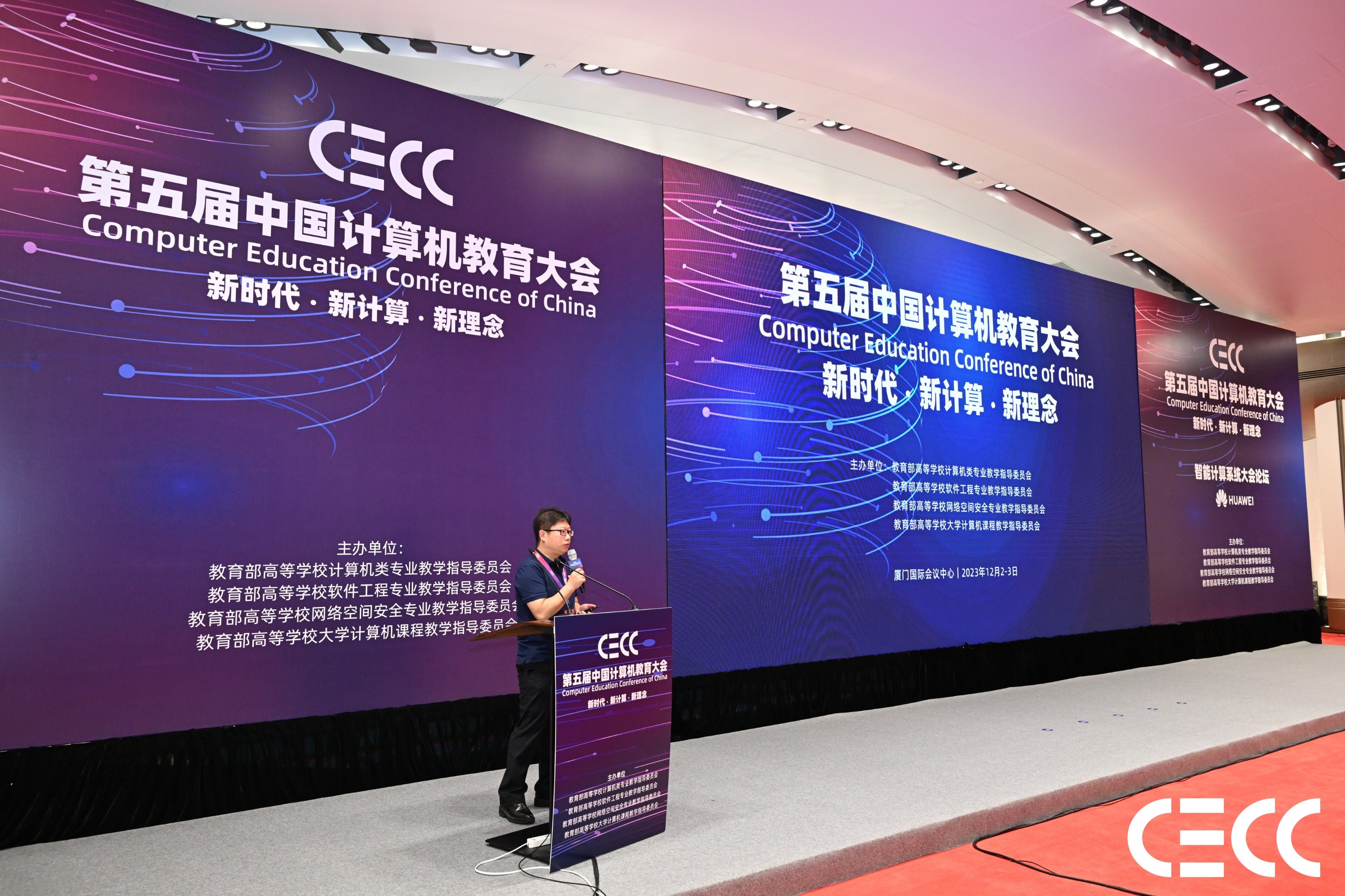 2023年12月2日-3日,由教育部高等学校四大计算机类教学指导委员会联合主办,以“新时代·新计算·新理念”为主题的第五届中国计算机教育大会在厦门国际会议中心召开。来自清华大学、北京大学、南京大学等5000名高校教师及包括华为、百度等在内的1000+企业代表参与本次大会,共话计算机、教育、技术及人才等产业的发展。p站副院长熊轲带队参加了本次大会,并受邀在智能计算机系统大会分论坛做题为“依智能基座,推101改革,育计算机人才”的主题报告。